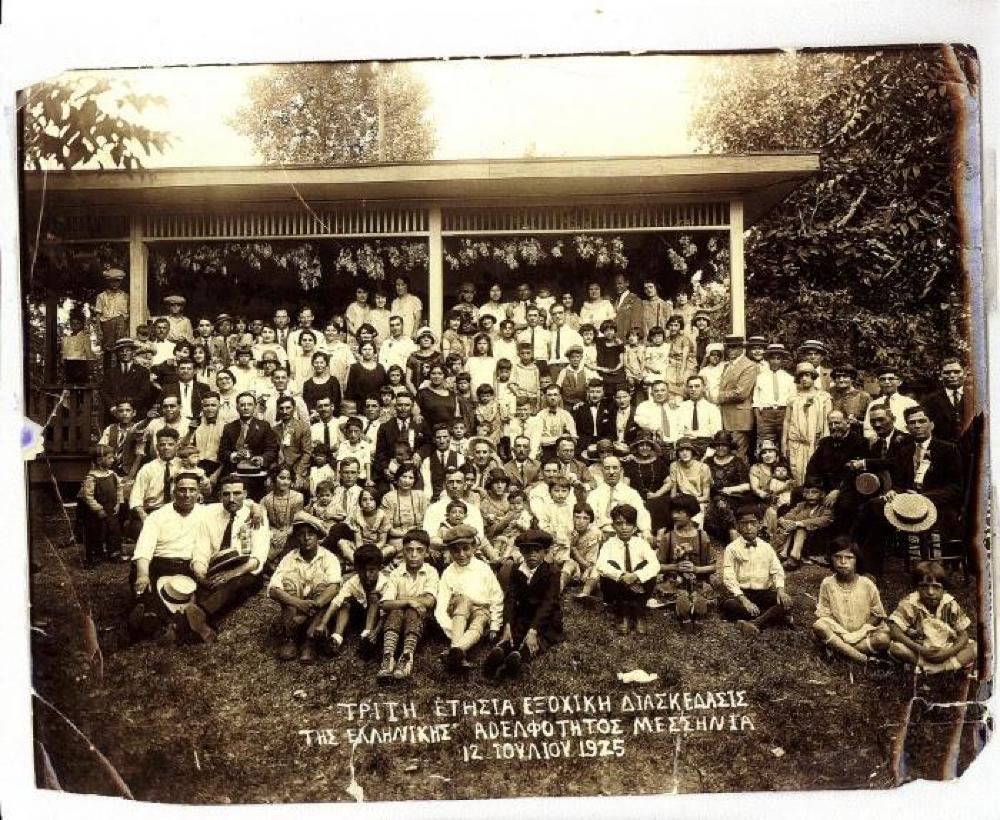 A black-and-white photograph of a group attending the Pan-Messinian Picnic. Outdoors.