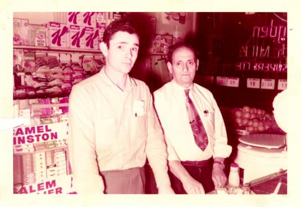 A photograph of David Lane, son in law, and Pavlos Sofiakis inside of Lakeview Foods.