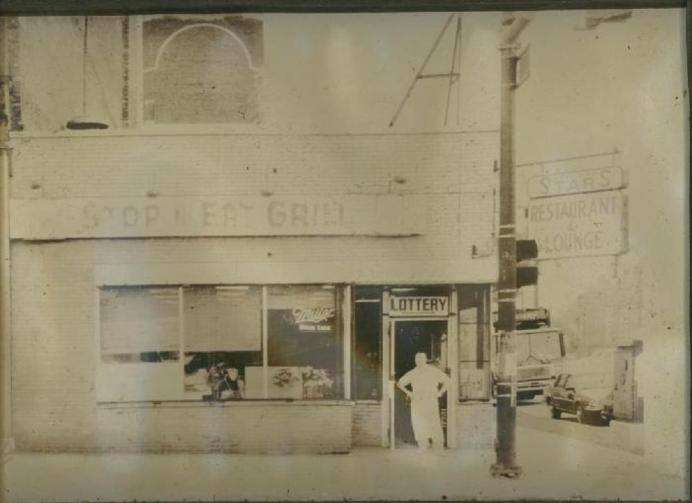 A black and white photograph of Frank Haralambos standing outside of Four Stars Restaurant on the opening day.