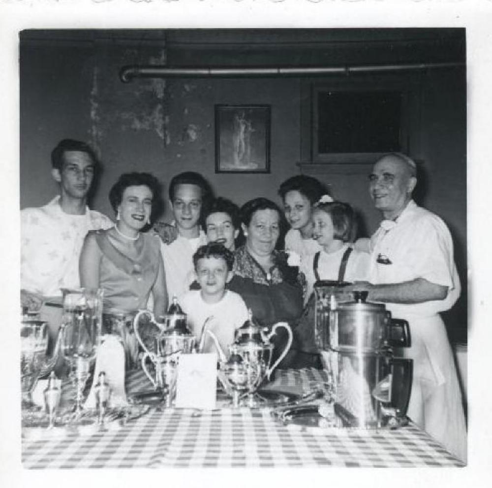 Family gathered around table. From Left: Peter, Elaine, John, Katherine, Mary, Harry, Demetra, James and Bill (seated). Inside the Acropolis