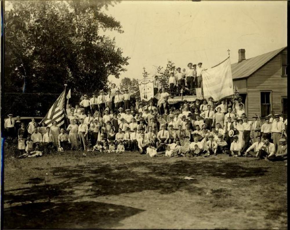 Vervena Picnic. Group posed at outdoor picnic with somatia banner and Greek and American flags.