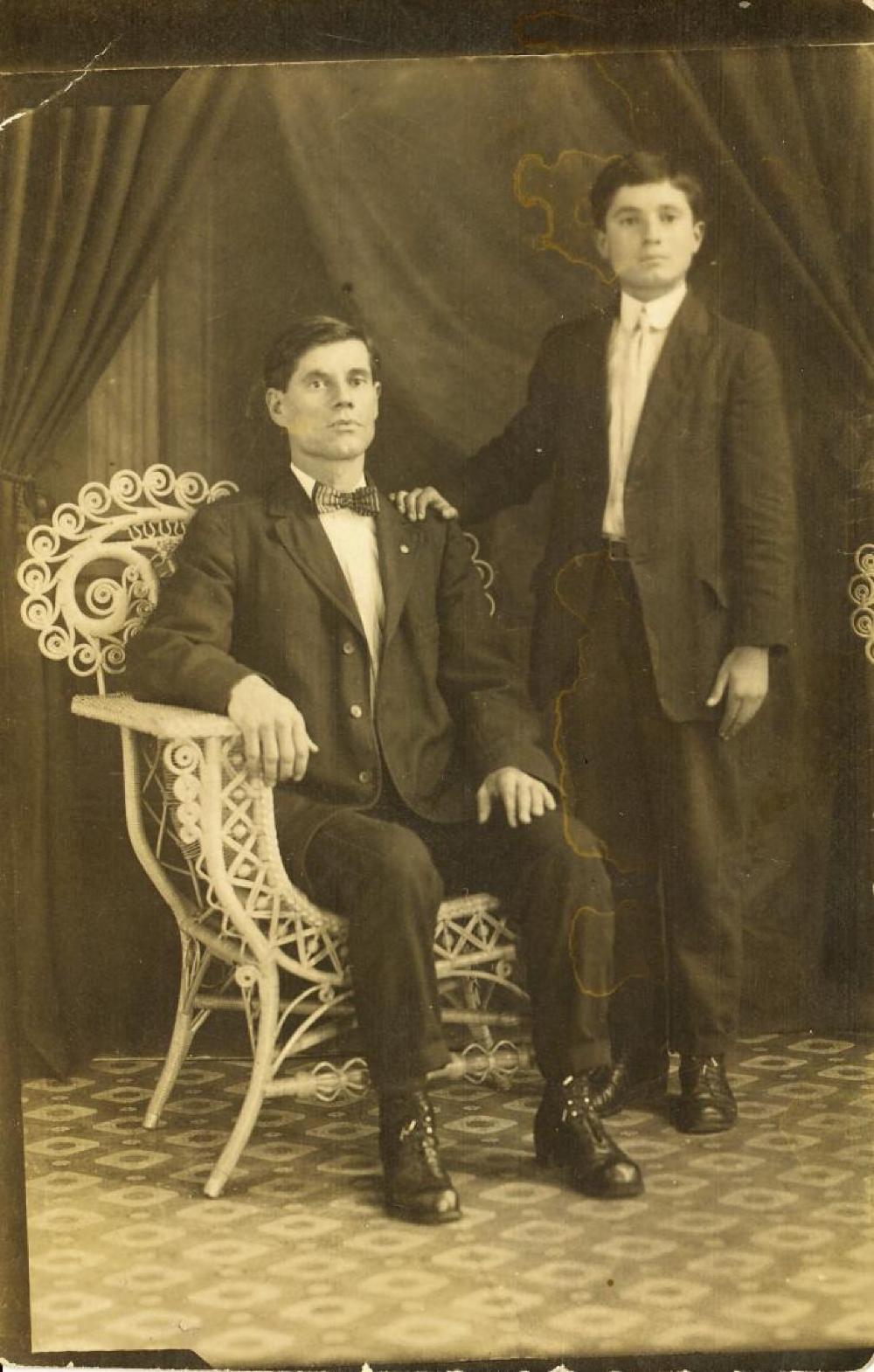 Formal sepia-toned portrait of a young man and an older boy. Both are dressed in dark suits, and white button-down collared shirts. The older man is wearing a finely striped bow tie while the young man is wearing a long white tie. The older man sits in an elaborately decorated white wicker chair, while the young man stands next to him with his right hand on his left shoulder.