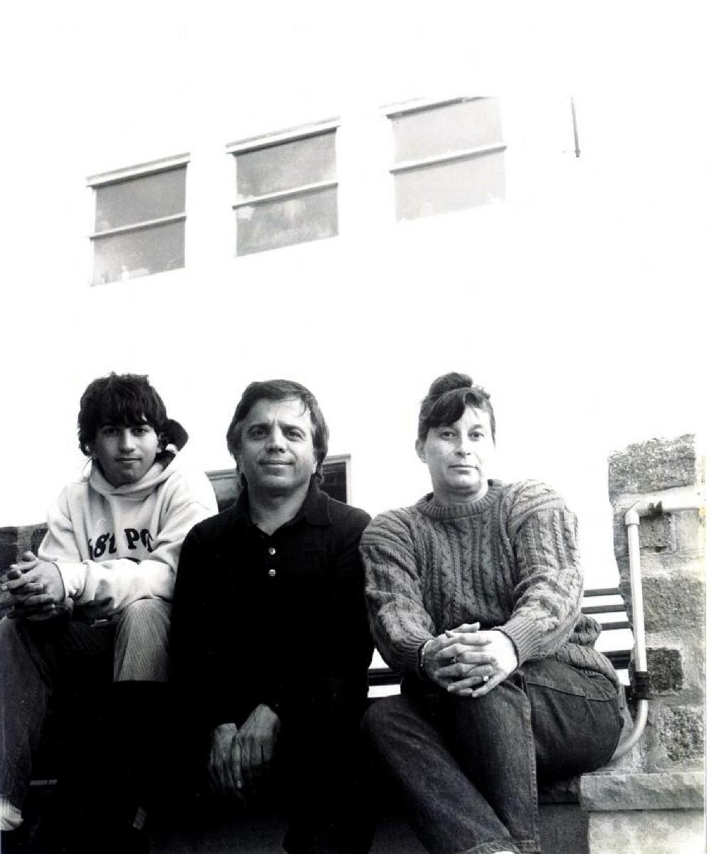 Exterior, Peter Spanakos and family. Peter Spanakos, in a long-sleeved collared shirt, is in the middle with his son on the left in a sweatshirt and his wife on the other side in a sweater. They are sitting outside with windows, brick, and railings in the back.