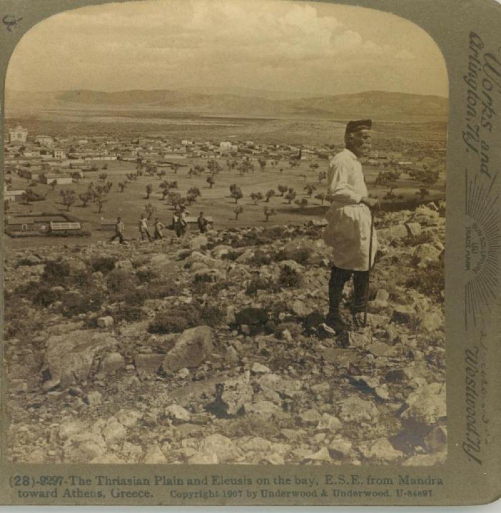 Stereoscope slide. Writing on left states "Underwood & Underwood, Publishers. New York, London, Toronto-Canada, Ottawa-Kansas"; Writing on left states "Works and Studios ~ Arlington, N.J. Westwood, N.J."; Writing on bottom states "(28)-9297- The Thriasian Plain and Eleusis on the bay, E. S. E. from Mandra toward Athens, Greece. Copyright 1907 by Underwood & Underwood. U-84897"