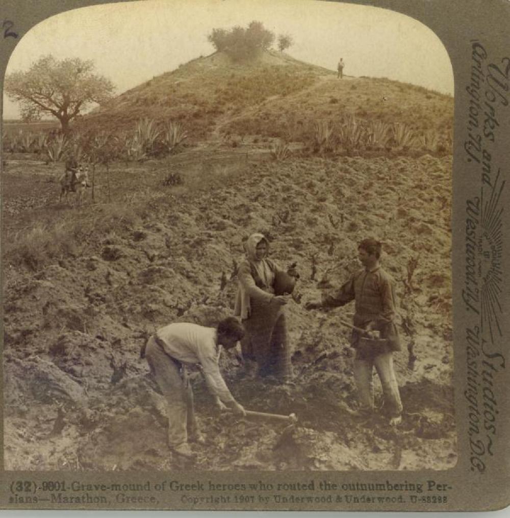 Stereoscope slide. Writing on left states "Underwood & Underwood, Publishers. New York, London, Toronto-Canada, Ottawa-Kansas"; Writing on left states "Works and Studios ~ Arlington, N.J. Westwood, N.J."; Writing on bottom states "(32)-9801- Grave-mound of Greek heroes who routed the outnumbering Persians-Marathon, Greece. Copyright 1907 by Underwood & Underwood. U-88288"