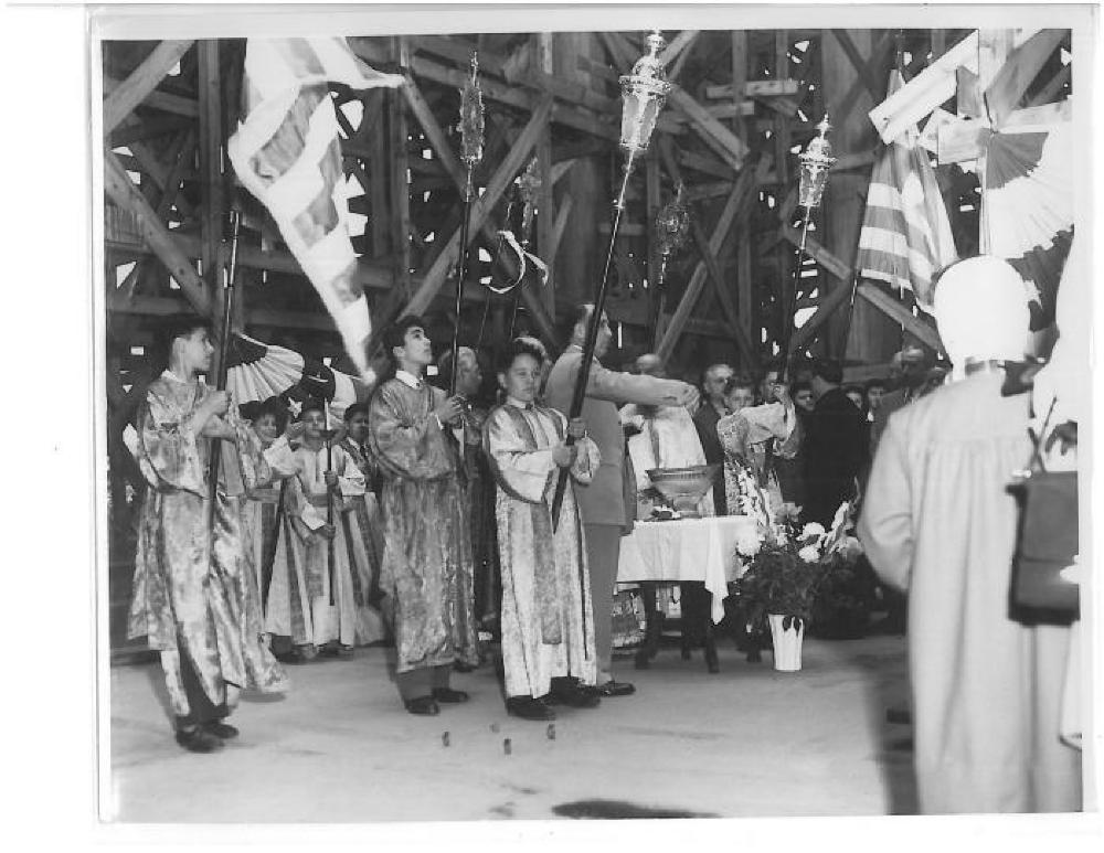 Black and white photograph from Saints Constantine and Helen Greek Orthodox Church during an Agiasmos.