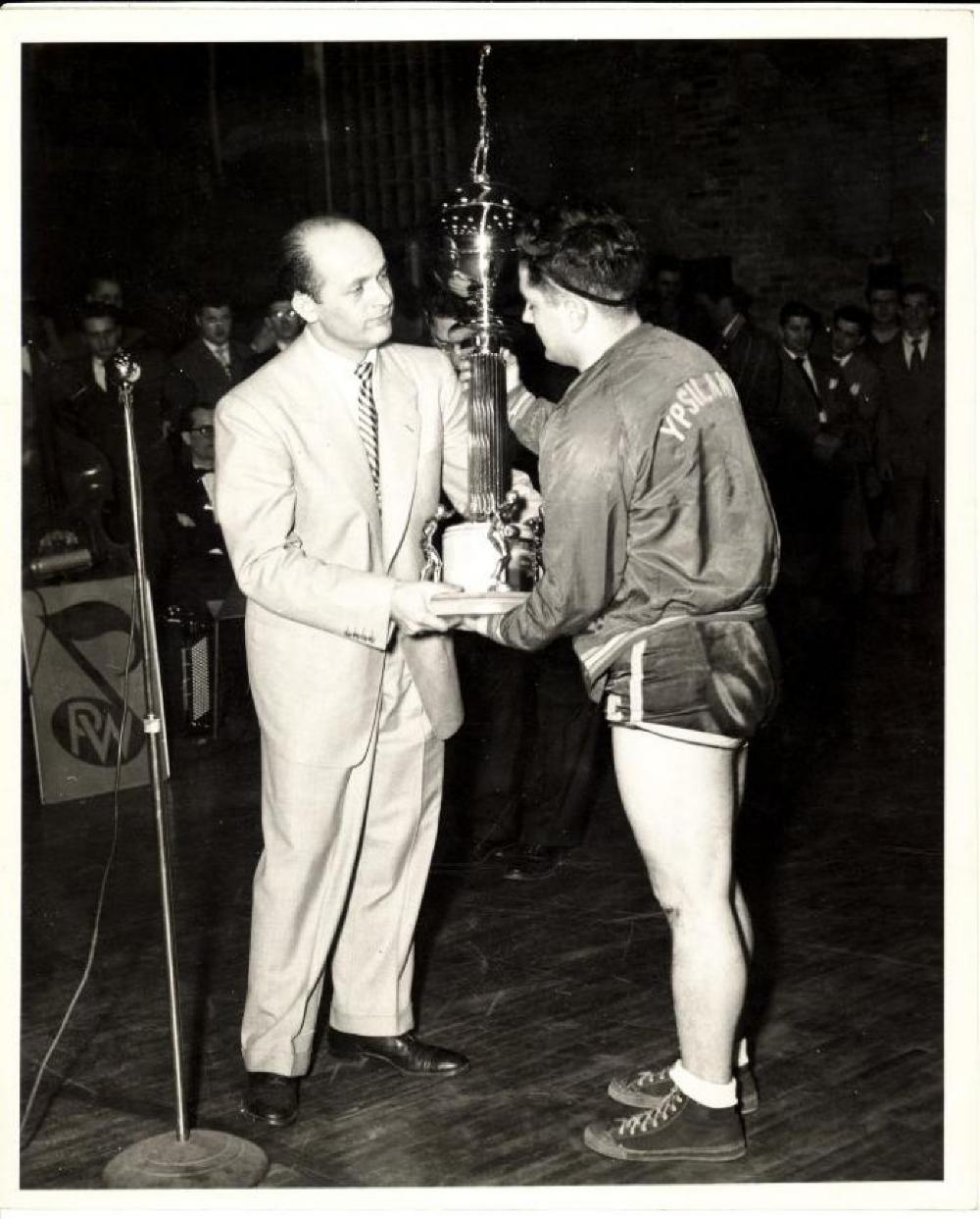 N.H.I.B.T. (National Hellenic Invitational Basketball Tournament) presentation of award. Bill Kartsunes to Bill Kastrinos, Ypsilanti basketball team member.