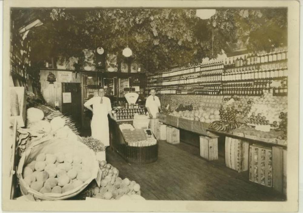 A black and white photograph of K-Market, 5006 W. Madison St. Chicago, IL, James Karones (L) and Paul Panos (R).