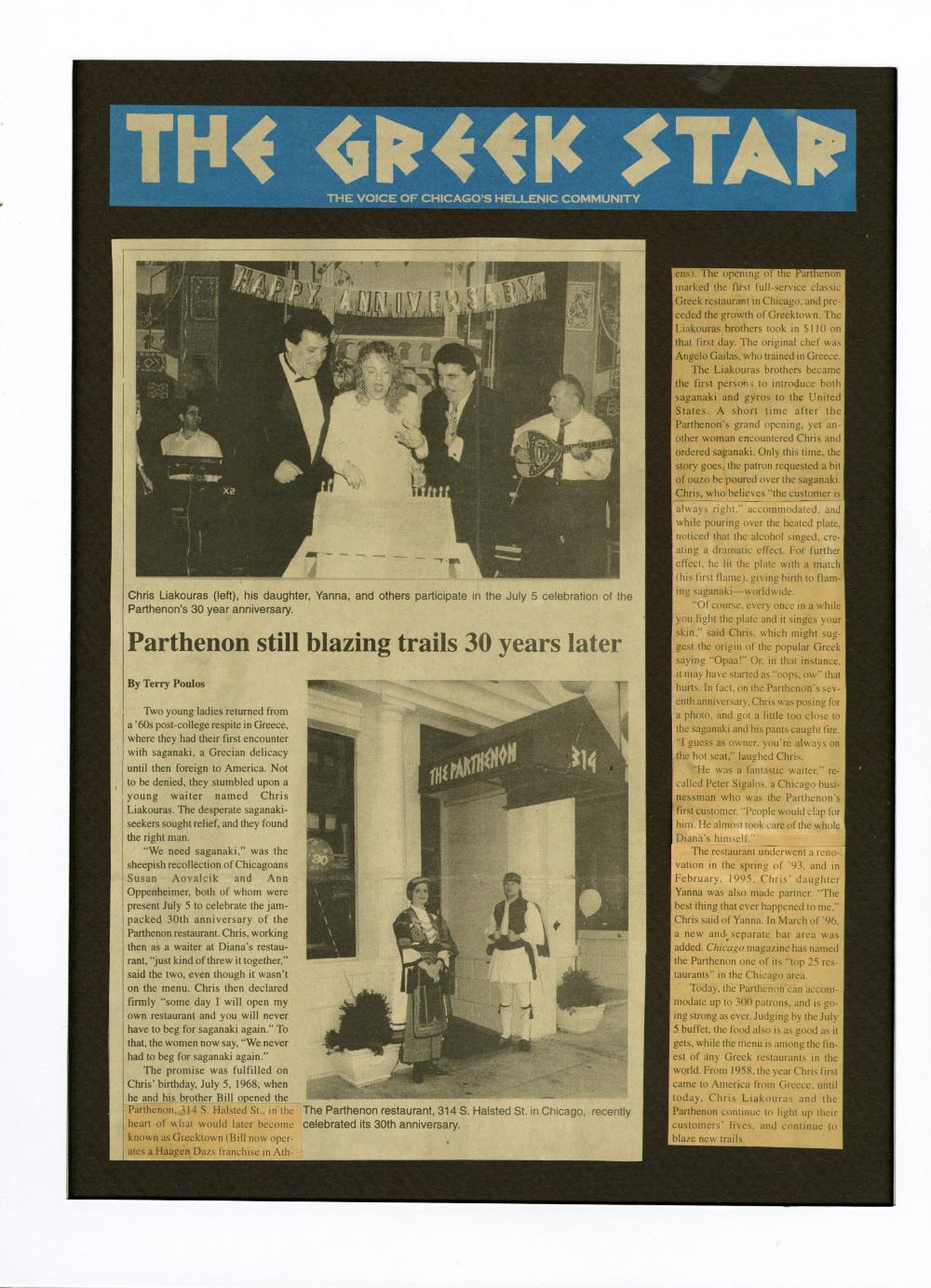 Clipping from The Greek Star written by Terry Poulos titled 'Parthenon still blazing trails 30 years later'. The article tells the story of the Parthenon Restaurant with two photos, the top one of Chirs Liakouras and his daughter Yanna celebrating the Parthenon's 30 year anniversary. The bottom photo features a man and a woman standing outside of the Parthenon Restaurant dresesd in traditional costumes. The clipping is glued onto board, framed.