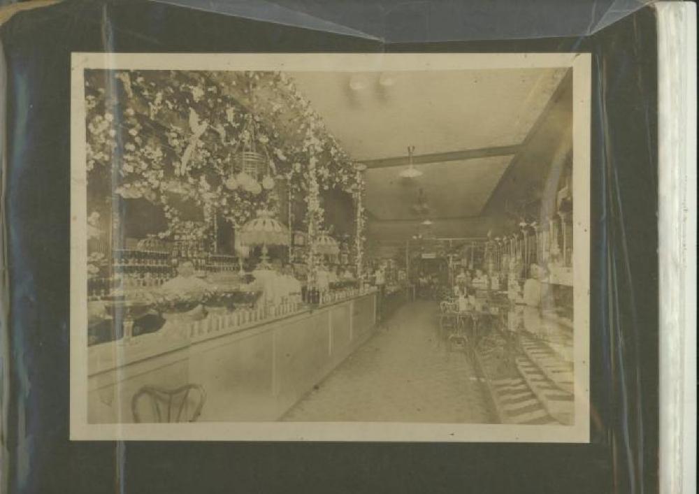 This is a black and white photograph of The Pallas Candy Co. On the right side of the store is a glass display case which contains various types of candy. There are three women standing behind this case. There are a couple of two chair tables along this as well. On the left side there is a wooden counter which has glass bowls with liquid in it. Behind this side there are mirrors lining the walls, and glasses and bottles of liquid. There are vines hanging from the ceiling. At the back of the picture and the store there is a seating area for customers.
