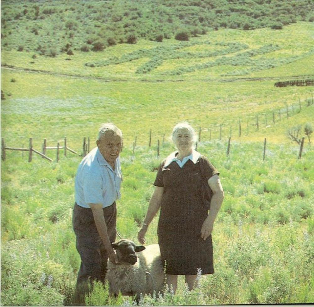 A colored photograph of a man and a woman (perhaps Regas and Maria Halandras) standing in a field holding a sheep. In the background, near the field of trees, are the letters RHÂ mowed into the grass.