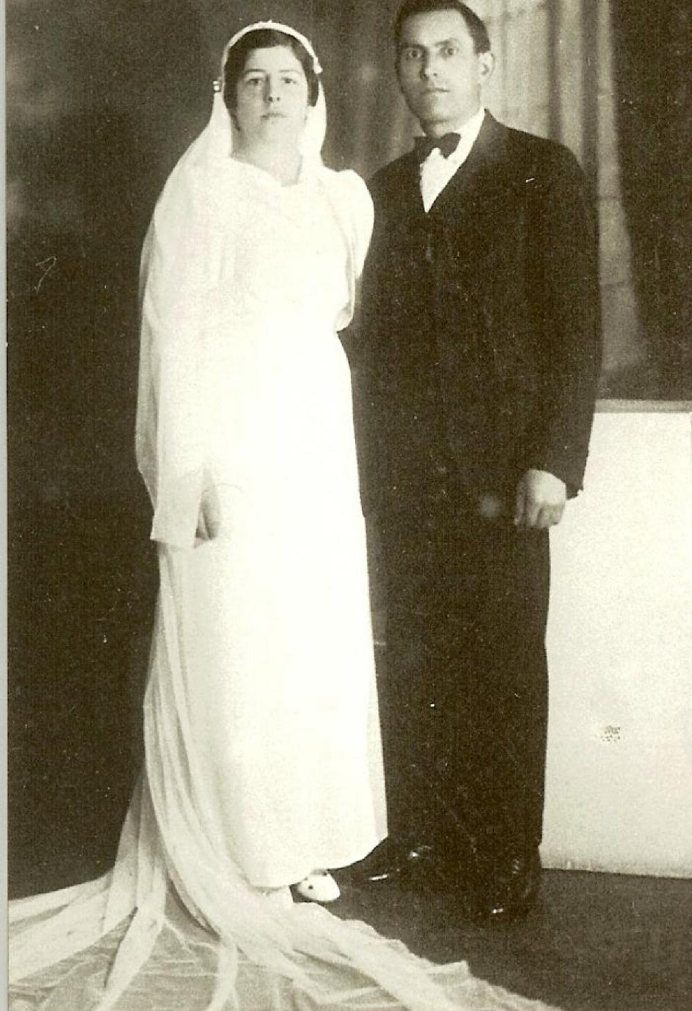 A black and white wedding portrait of two individuals (perhaps of Maria and Regas Halandras).