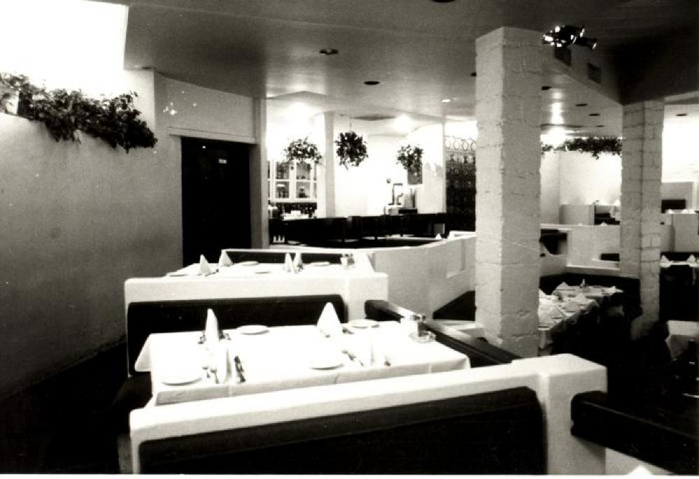 A black and white photograph of the interior of Denis Den. The image showcasing tables and two pillars in the background.