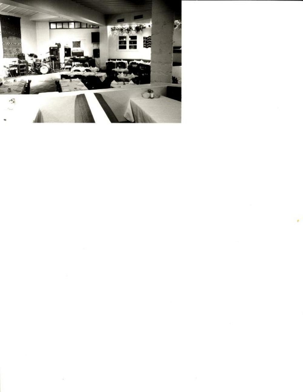 A black and white photograph of the interior of Denis Den. The image showcases tables with a performing stage with instruments in the background.