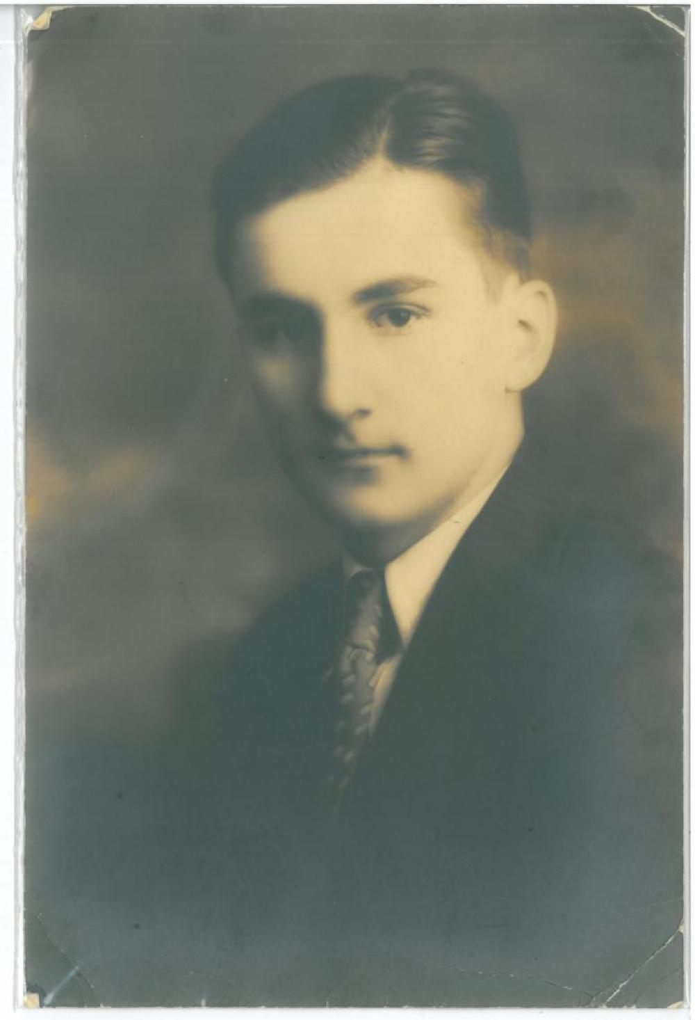 A black and white portrait of a young man. It is of his head and to his chest. He is turned towards the camera. He has dark hair and dark eyes. He is wearing a suit with a patterned tie, and a white undershirt. The left side of the photo is slightly blurry.
