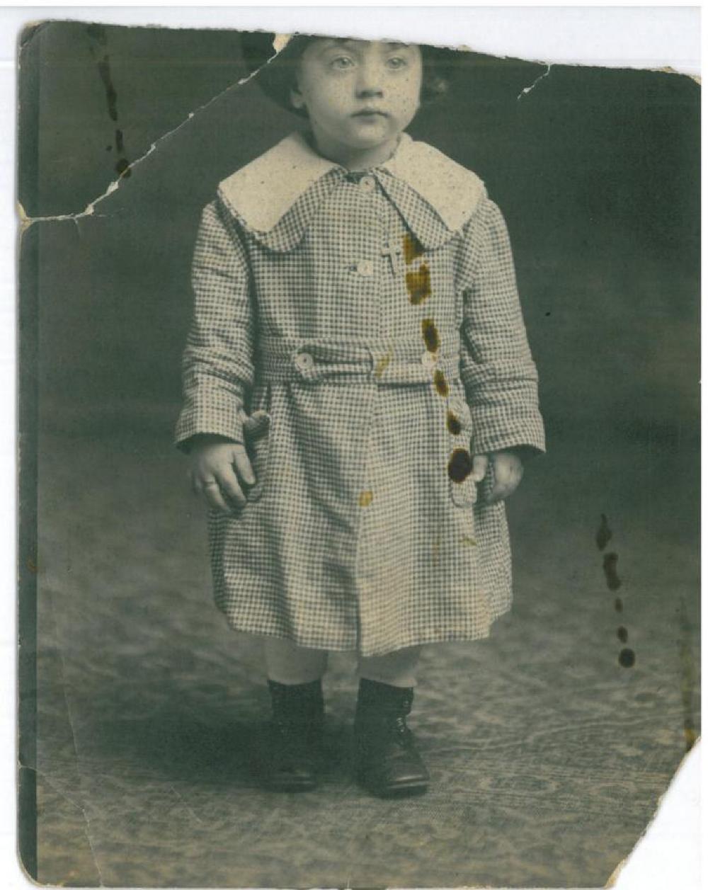 A black and white portrait of a young girl. She is standing in the middle of a carpet, wearing a checkered coat. The coat has two buttons going down, and a white collar. It also has a belted waist and a pocket at each hip. The little girl is wearing white pants and black shoes. It looks like she is wearing a hat, however, the picture is cut off. She stands with both arms at her sides and is wearing a ring on her right middle finger.