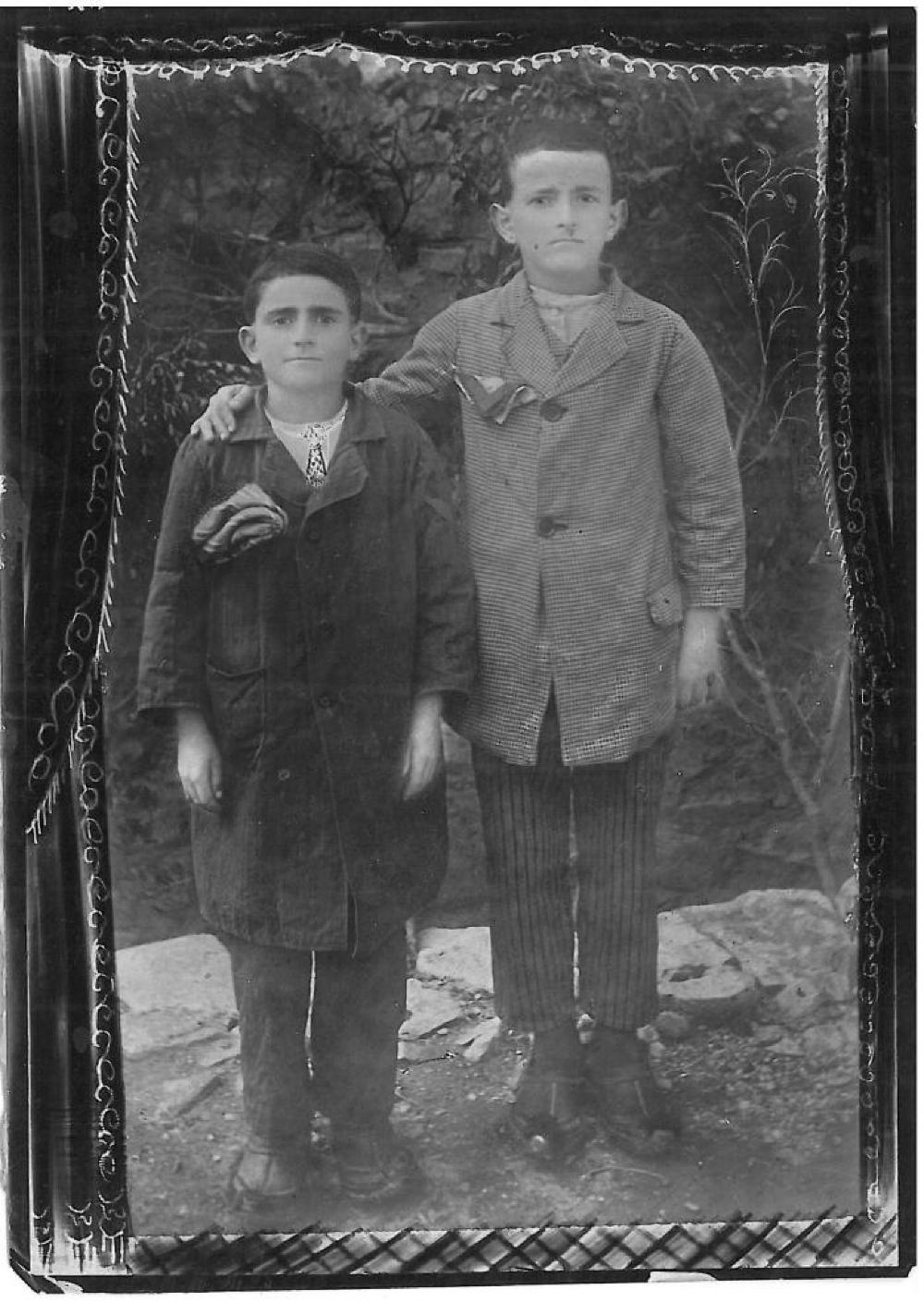 A black and white photograph of two young boys standing outside. The boy on the left is shorter, he has dark hair and dark eyes. He is wearing a long dark colored stripped jacket, and dark pants and shoes. He has a white shirt on underneath his coat, it appears as though someone drew a tie on him. The boy on the right is wearing a checkered coat, and stripped pants. He has on dark socks and shoes, and a termal undershirt. Both boys have hankercheifs in their pockets. They are standing outside in front of a forested area.