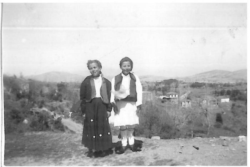A black and white photograph of a young boy and girl in tradtional Greek costume. They are standing outside, lover looking a small town. The girl is wearing a long black skirt with white polka dots on it, a black jacket, and white undershirt. She has on a headpiece which has a long tassel. The boy is wearing a white skirt with many pleasts, a white shirt, a dark colored vest, a hat,white stockings, and black ties around his knees.