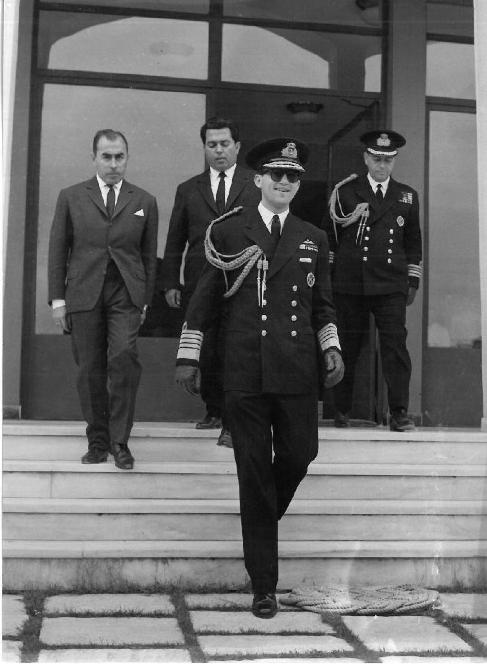 A black and white photograph of HM The King of the Hellenes in his military uniform walking down steps outside of a building. He is wearing a darker colored uniform and his jacket has the rope along one shoulder and he has some pins on the other side. He is wearing a military-type hat and gloves. Behind him are two men in suits and another man in a military uniform walking down the steps. On the back there is a purple stamp in Greek.