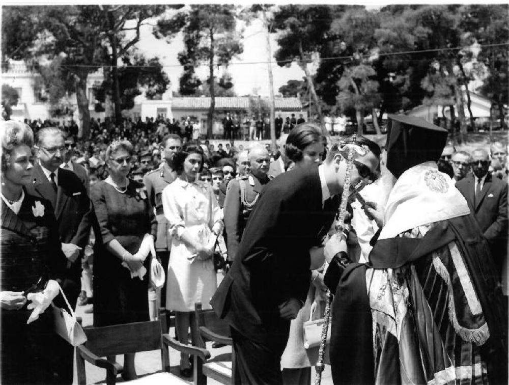 A black and white photograph of HM The King of the Hellenes kissing the cross that the Greek Orthodox Priest is holding at an outdoor service. There is a huge crowd behind them and HRH Princess Anne-Marie of Denmark is to his side. He is wearing a suit and sunglasses and the Priest is in his robes and holding a cross in one hand and a staff in the other.