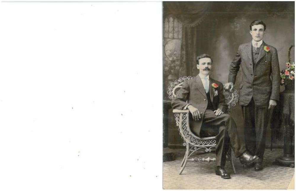 Black and white photograph of two men wearing suits, one sitting down with his legs crossed, and the other standing by his side, holding on to the chair. In the background is a very decorative household and it's living room. The photograph seems to have been tampered with and has bright color marks in various places.