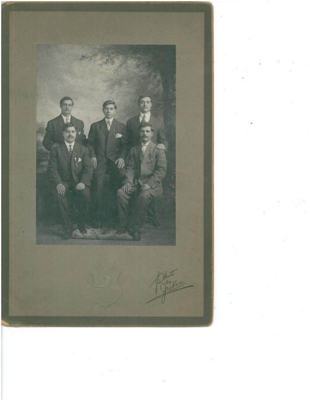 Black and white photograph of a group of five men in a formal photography studio. On each side is a man sitting on a stool with another man behind him with his arm on the man who is sitting's shoulder. In the center a man sits on a higher stool in between the four men. All five men are dressed in suits and ties with hair combed to the side. In the center on the ground is a fur rug the men's feet is on. The backdrop is a painted scene of trees, a river, and a bridge.