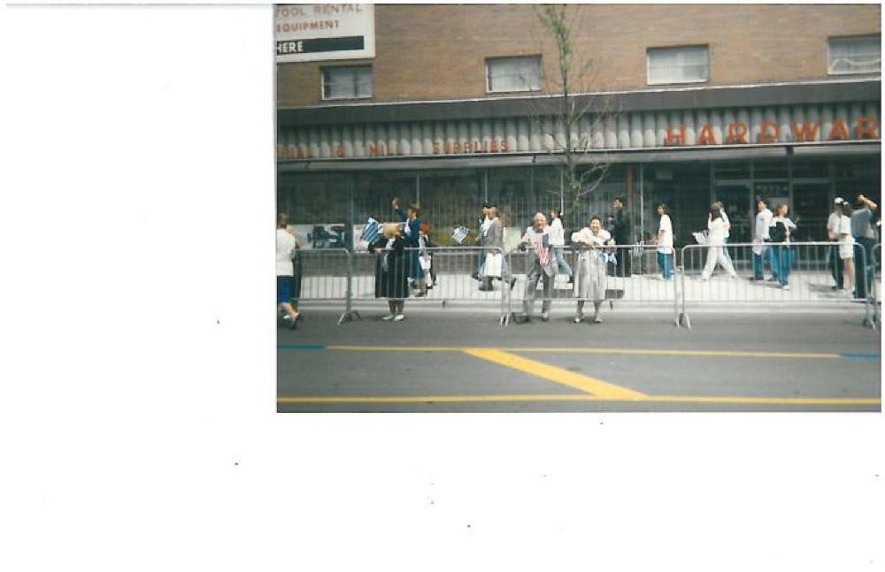 Photograph of a couple on the sidewalk watching the Independance day parade. The man is wearing a grey suite and is holding an American flag. The woman is in a grey knee length dress and she is holding a Greek Flag. both figures are standing next to the gardrails and looking at the photographer. They are standing in front of a hardware store and there are varios peopl walking behind them.