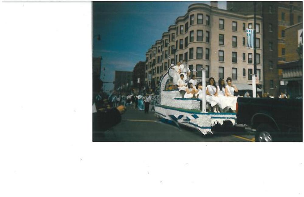 A group of people riding a float in the Greek Independance Day parade. the front row has three women seated in costume toags and sashes acroos their chests that re "Socrates" . there are three more rows of men and women behind them waving Greek Flags