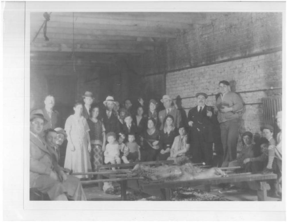 Black and white photograph of a group of people. The people are inside a building and are standing or sitting around lamb cooking over coals. There are 27 people, men, women, and children.