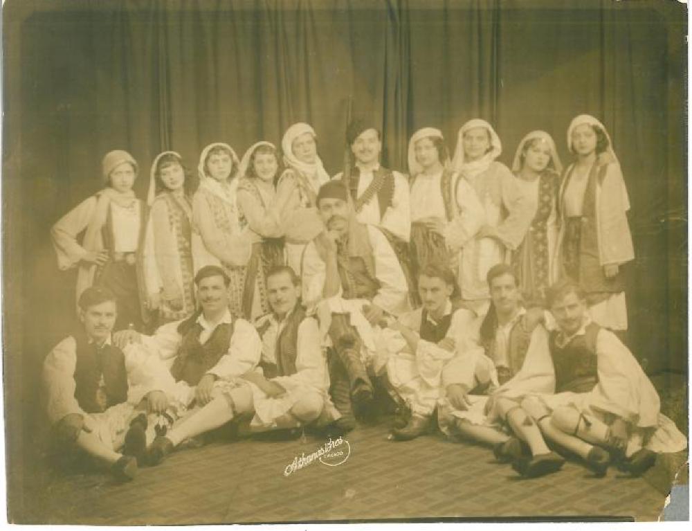Black and white photograph of 17 men and women dressed in traditional clothing. They are in two lines - 9 women surrounding one man in the back (holding a gun) comprise the back row, while 7 men make up the first row. All seem to be posed for the camera A small text stamp in white reads "Athanus Bros Chicago" at the bottom of the photograph.