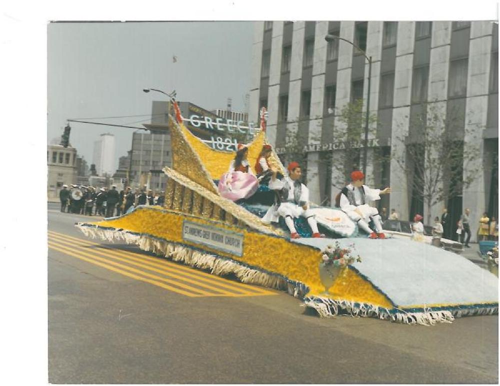 8" x 10" color photograph. St. Andrews Greek Orthodox Church Float in the Greek Independence Parade in 1967. Two women and two men atop the float. Float has the title 'Greece 1821" behind people. First float in the parade. Chicago Sun Times visible in the background. Four ink stamps on back of photograph: date, image number, studio name and price of reprint.