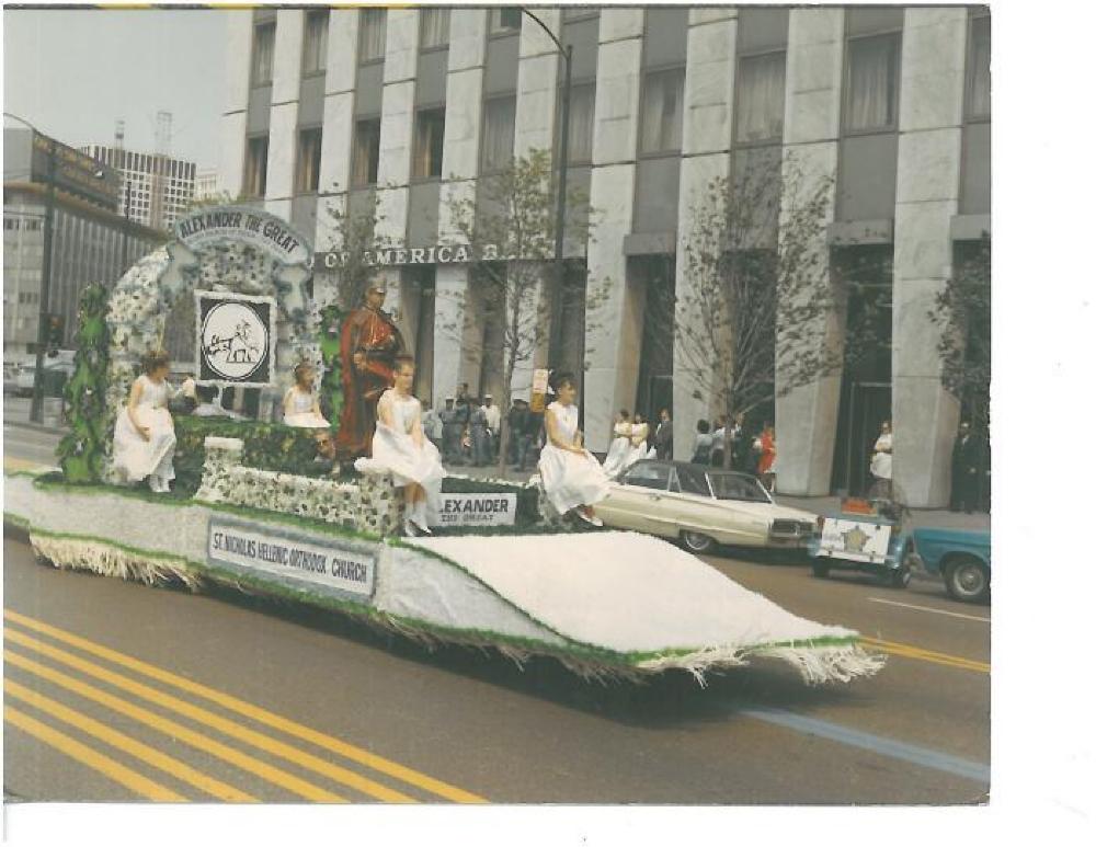 8" x 10" color photograph. Image of Chicago's 1967 Greek Independence Day Parade on State Street. Float contains 5 little girls, along with one man. This float represents Alexander the Great. Chicago Sun Times visable in the background of image. 4 ink stamps on back of the photograph: date, studio name, image number and price to reprint.