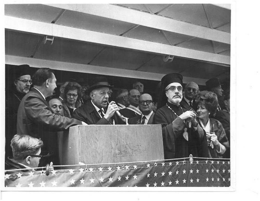 8" x 10" black and white photograph of parade marshall, Constantine Stamis, speaking at the first Chicago Greek Independance Parade on State Street in 1967. Mayor Richard J. Daley and Archbishop lakovas standing next to parade marshall.