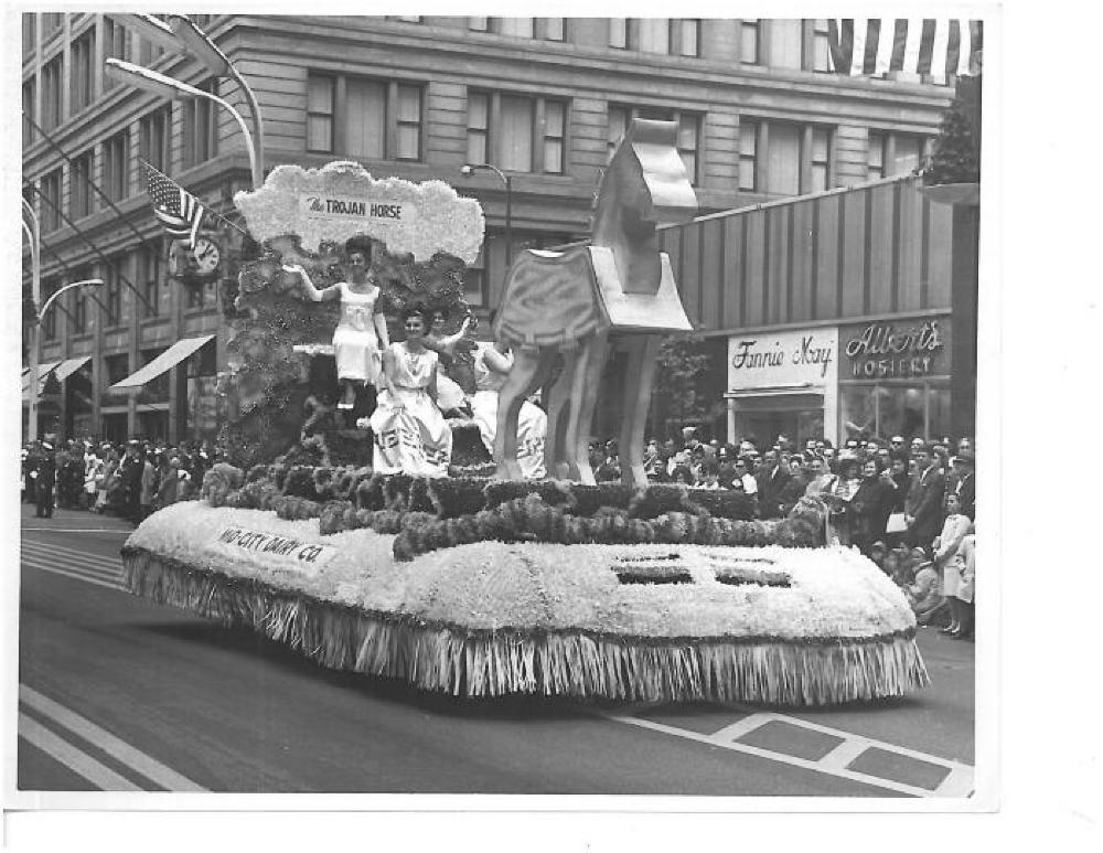 8" x 10" black and white photograph of float in the first Chicago Greek Independance Parade. Float sponsored by Mid-City Dairy Co. Float represents the Trojan Horse. Four women atop of the float in white dress, adorned with the Greek key pattern.