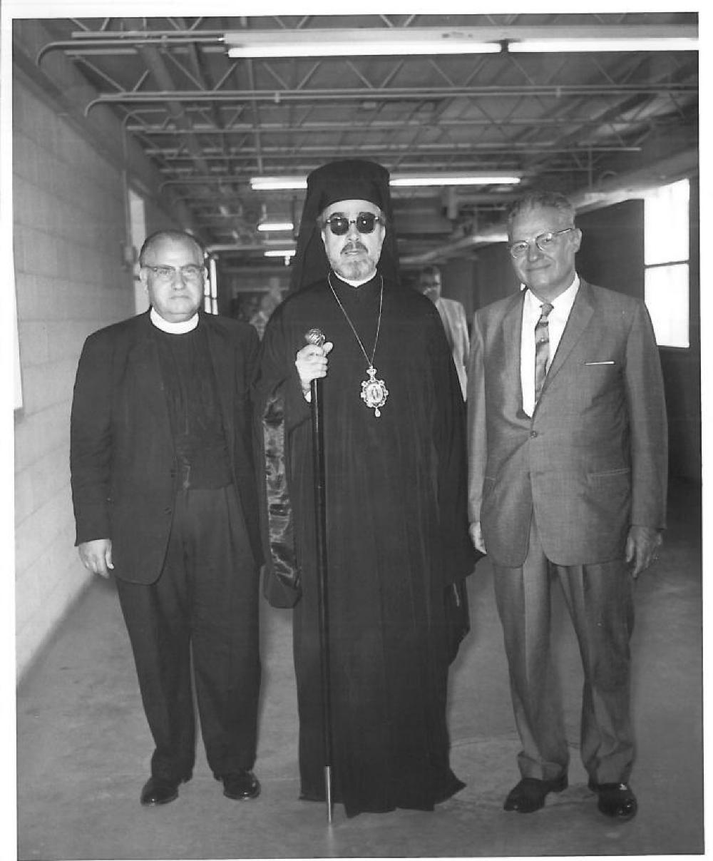 Black and white photograph of Arthur Peponis, Arch Bishop Iakovos, and an unknown man.
