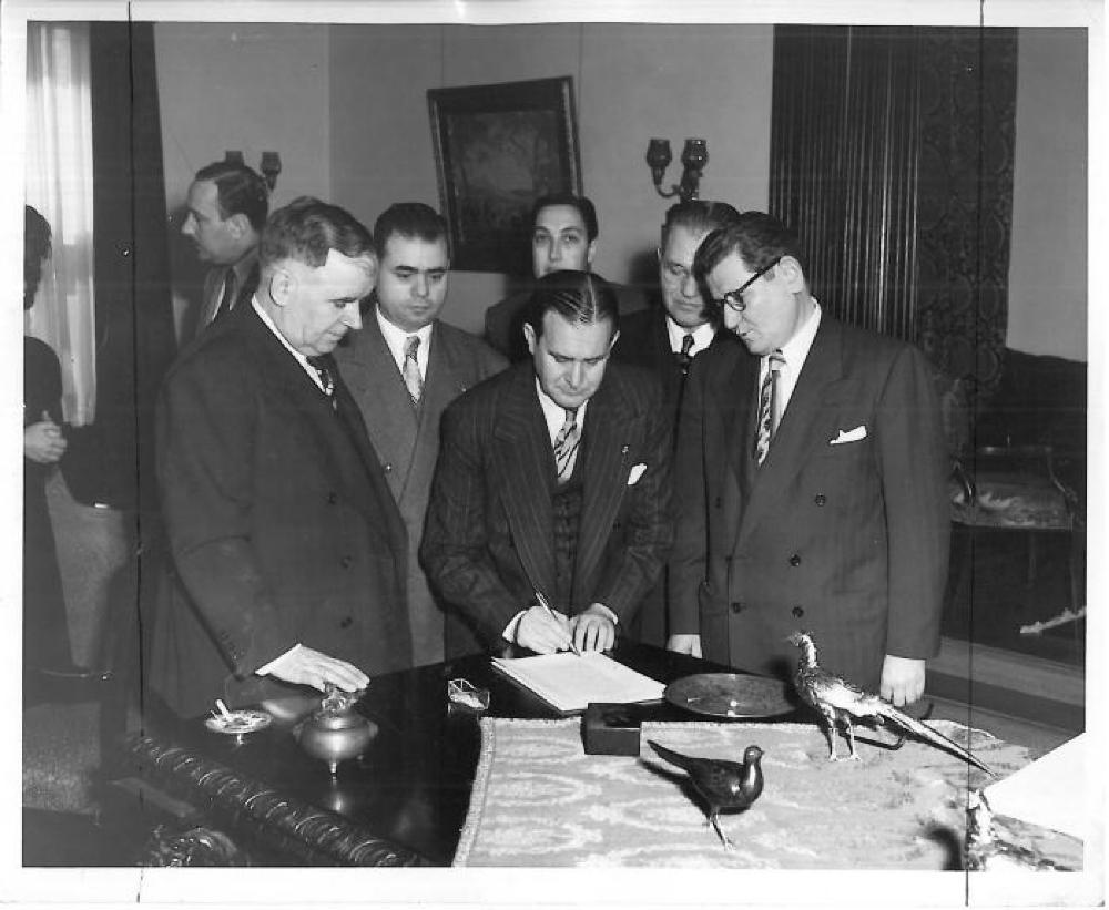 A Black and white photograph of Arthur Peponis and other men signing a document.