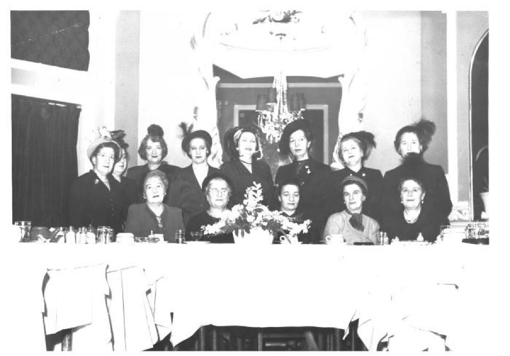 Landscape orientated black and white photograph. Photo is of a group of people gathered at a table at a formal dinner reception. There are two men in front of a podium dressed in the clothing of Greek Orthodox priests. Gathered around them on either side are women in dress clothing. One is wearing a flower crown head piece in her hair. In front of them is a long table with a white tablecloth and a floral arrangement, and in front of that are the heads of more women, and a microphone off to the left hand side.