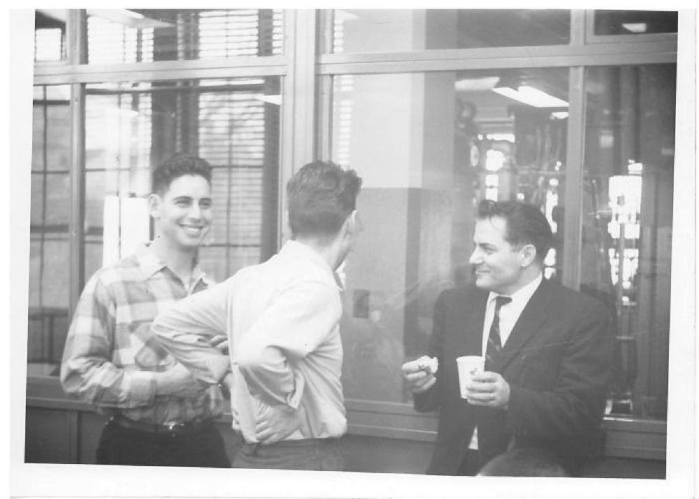 A black and white photograph of George Thodos as a middle-aged man holding a paper cup and some bready food. Two young men stand near him, one with his back turned in a light shirt and another smiling in a plaid shirt. In the background through a window machinery can be seen.