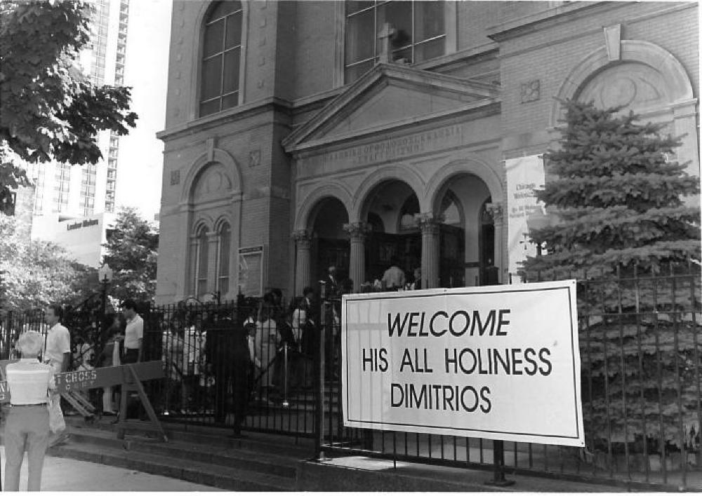 Black and white photo of the front of a church with a line of people. Sign saying: "Welcome his all holiness dimitrios" Children await turn to enter the Annunciation Cathedral for Patriarchal Blessing.