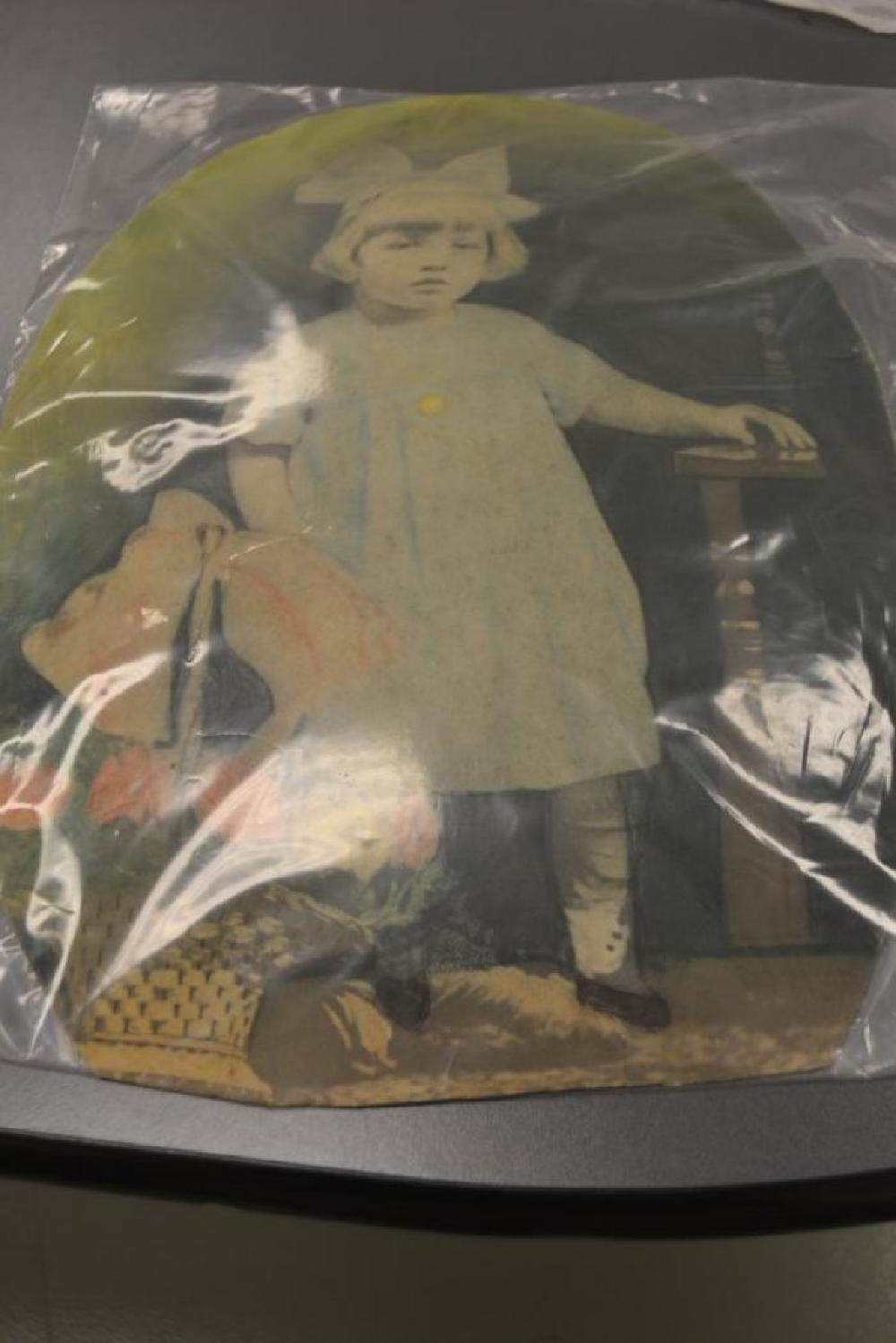 This is picture of a very young Coula Papadatos. Based on the writing on the back, Coula may be the daughter of Harry Papadatos. The print appears to have originally come from a black-and-white photograph and has been heavily colored by hand. Some of the features may not have been in the original photograph and may have been added during the colorization process.