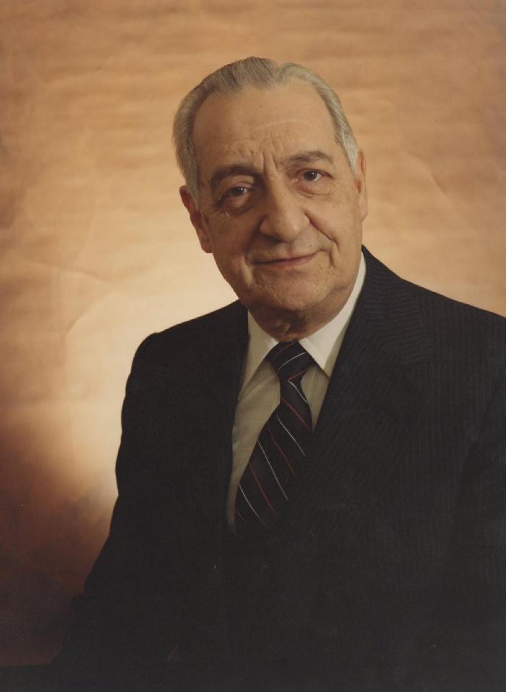 Color picture on photo paper. Subject is John Geocaris. He is an older man with grey hair and dark eyes. He is facing the camer and the right side of his body is slightly angled back. He is wearing a black and grey pinstripe suit, a white button-down shirt, and a black tie with red and white stripes. Photo is of his torso and up. The background is a pinkish brown.