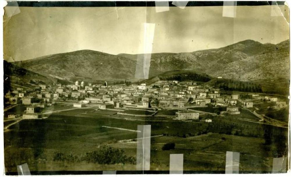 Black and white photograph of a town in the mountains. It has a black border on the top and bottom. In the foreground, there are fields surrounded by stone walls. Behind these fields, there are houses. On the left side of the photograph, there is a tall building that looks like a church. Two towers can be seen, one with a rounded dome. The houses are a lighter color than their roofs. Behind this town, there are mountains. This photo is rather dark colored. The back is plain, except some penciled in writing that says "16 across, 9 1/2"