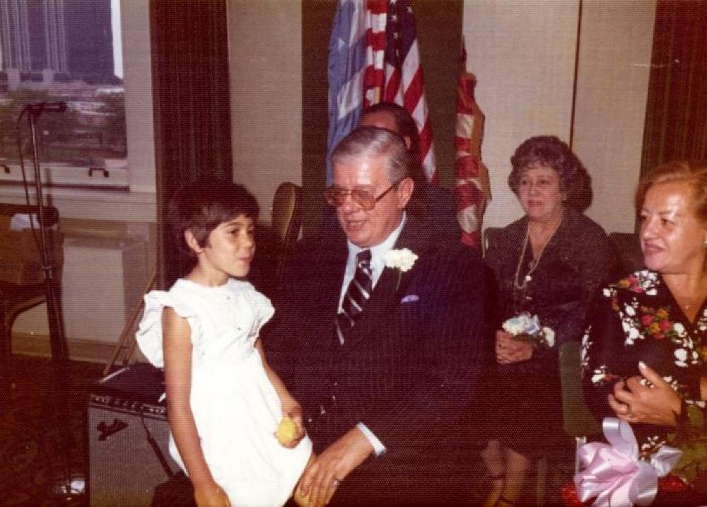 Color photograph of a group of people. There is a Greek and an American flag in the background, as well as a microphone and an amp on the left side of the photo by a window. The photo is of a man sitting down wearing a black striped suit with a light blue shirt and black and grey tie. There is a little girl in a white dress sitting on his knee with something yellow in her hand. She has short hair. In the background, there are three people sitting down. One is directly behind the man, and the other two are women wearing black. The back of the photograph reads "12-25."