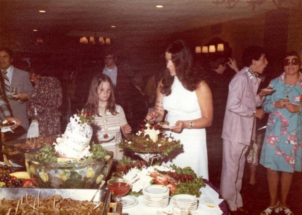 Color photograph of a group of people standing around a buffet table. The focus of the photo are on a woman and a girl. The woman is wearing a white dress with armbands on her right arm. The girl is wearing a tan and white striped dress. The buffet has a white tablecloth and is covered with various food. On the right side of the photo, there is a man in a purple suit talking to a woman in a light blue dress with pink flowers. There are many other people in the background. The back of the pictue is labelled "13-12A."