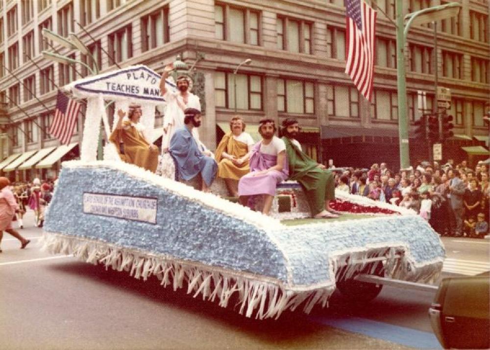 Color photograph of a float in a parade. The float is blue and white, with pillars in the background, on top of which it says "Plato Teaches Many" There are men on the float wearing brightly colored togas.The back of the picture reads "3-32"