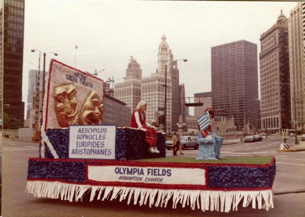 Color photograph of a float in a parade. It has blue sides and a white backboard that reads "Ancient Greek Theater" and has the theater masks on it. There is a woman and a child sitting on the float. The child is sitting in front of the woman and holding a Greek flag. The side of the float says "Olympia Fields Assumption Church" and "Aeschylus, Sophocles, Euripides, Aristophanes." The back of the photo reads "922"