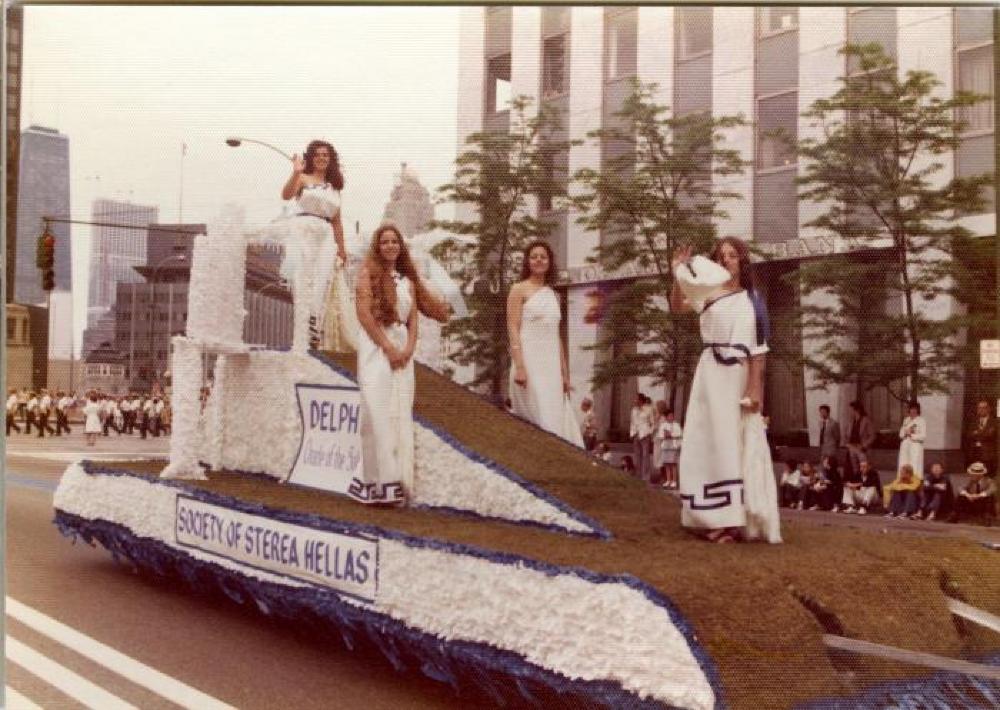 Color photograph of a float in a parade. The float has white sides with a blue sign that says "Society of Sterea Hellas". The base of the float is green. There are four women on the float wearing white dresses which have a blue Greek key design on them. there is a platform in the middle surriounded by white that one of the women is standing on. The woman in the front right appears to be holding something white in her hands. The back of the photo says "916"