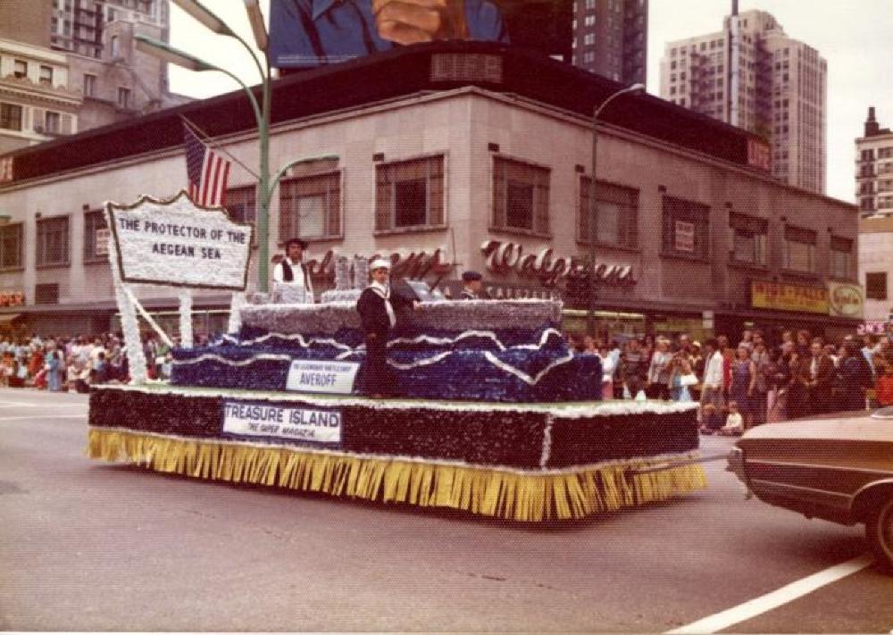Color photograph of a float in a parade. The float has black sides with yellow fringe. There is a sign on the side that says "Treasure Island" On the float, there is a child dressed as a sailor as well as a man on the back and another child on the other side. In the middle, there is a blue black that looks like water and a grey battleship. A sign says that it is called the "Averoff." The back of the float has a white board that says "The Protector of the Aegean Sea." The back of the photo says "5-19"