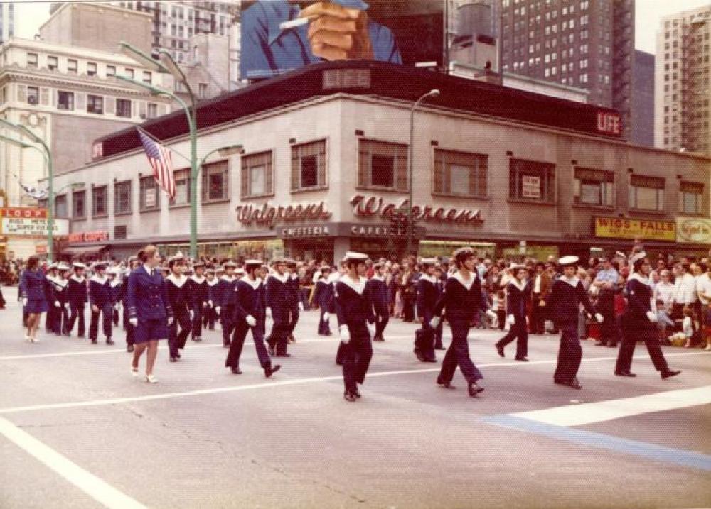 Color photograph of people in a parade. They are boys dressed in dark blue uniforms with white collars and white hats. They are also wearing white gloves. There are two women to the side in blue skirts and jackets with white shirts and white gloves. The back of the photo says "5-17."