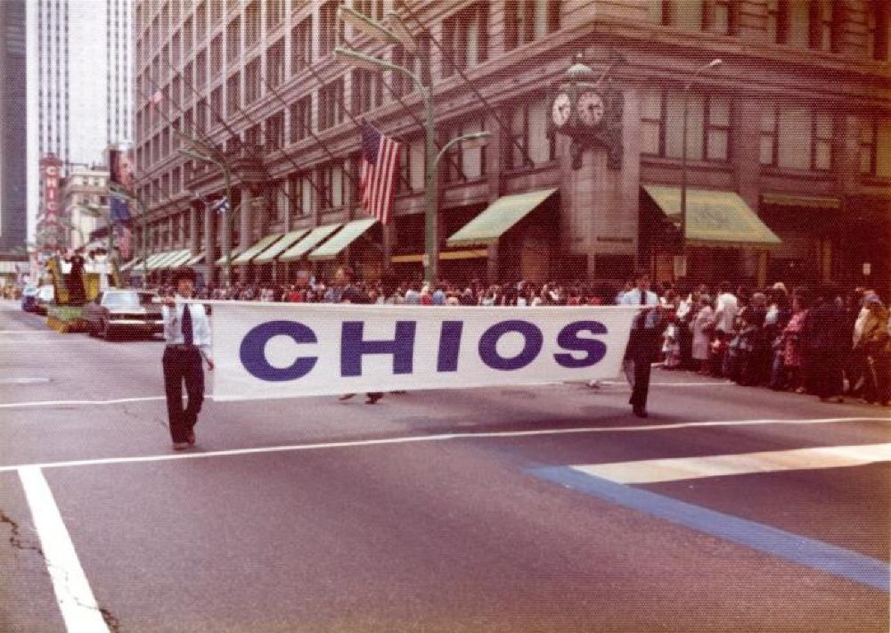 Color photograph of people in a parade. There are two boys in black slacks and a light blue shirt carrying a sign that reads "Chios". Behind them, ther is a car pulling a float. The back of the photo reads "4-5."